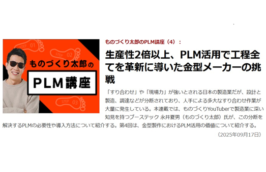 「モノづくりスペシャリストのための情報ポータル - MONOist」 にて連載中の「ものづくり太郎のPLM講座」第4回に、当社の取り組みが紹介されました。 記事タイトルは「生産性2倍以上、PLM活用で工程全てを革新に導いた金型メーカーの挑戦」で、当社のPLM活用事例が詳しく取り上げられています。